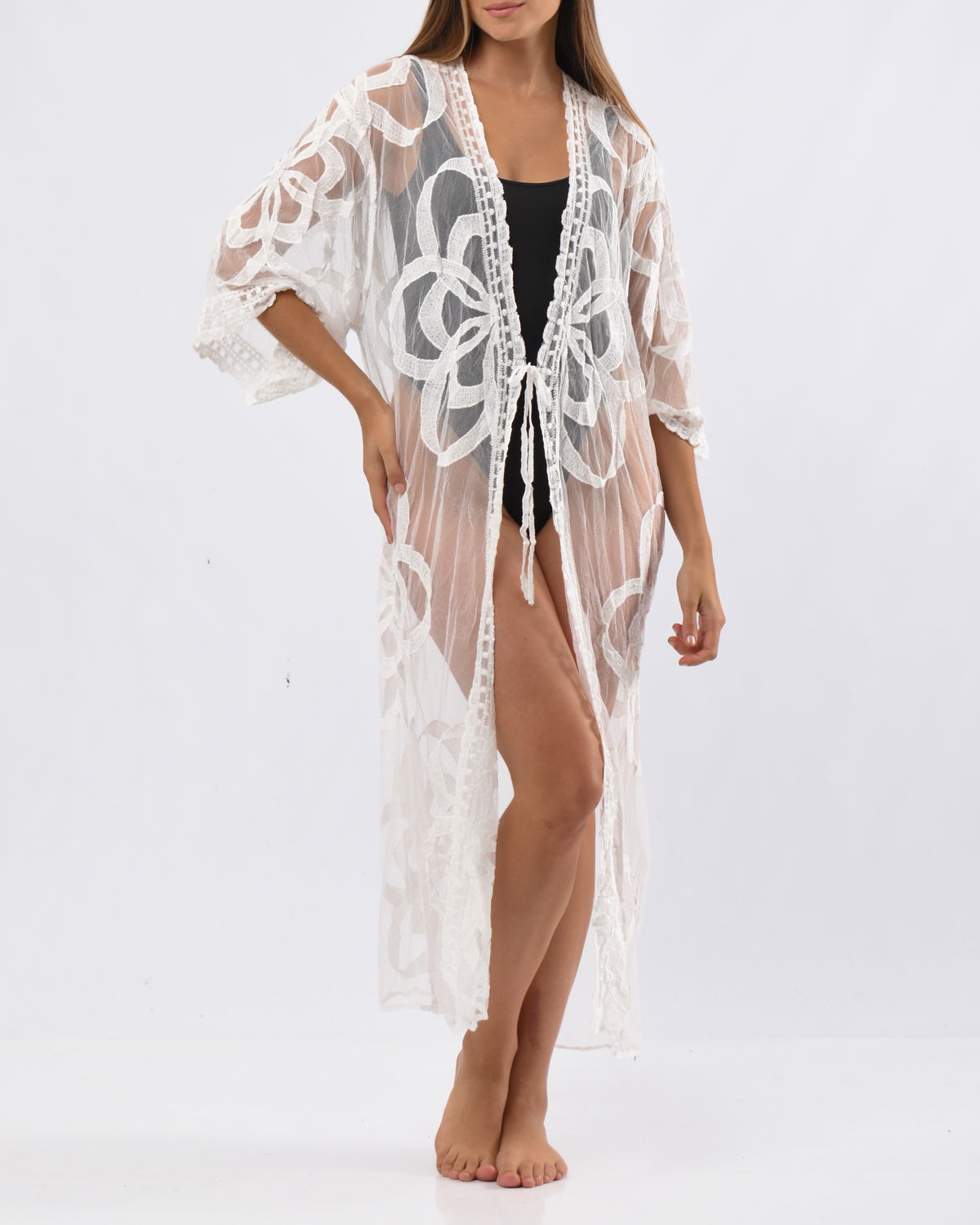 Detalles: Largo por debajo de las rodillas. Abierto con tiras a la altura de la cintura para atar