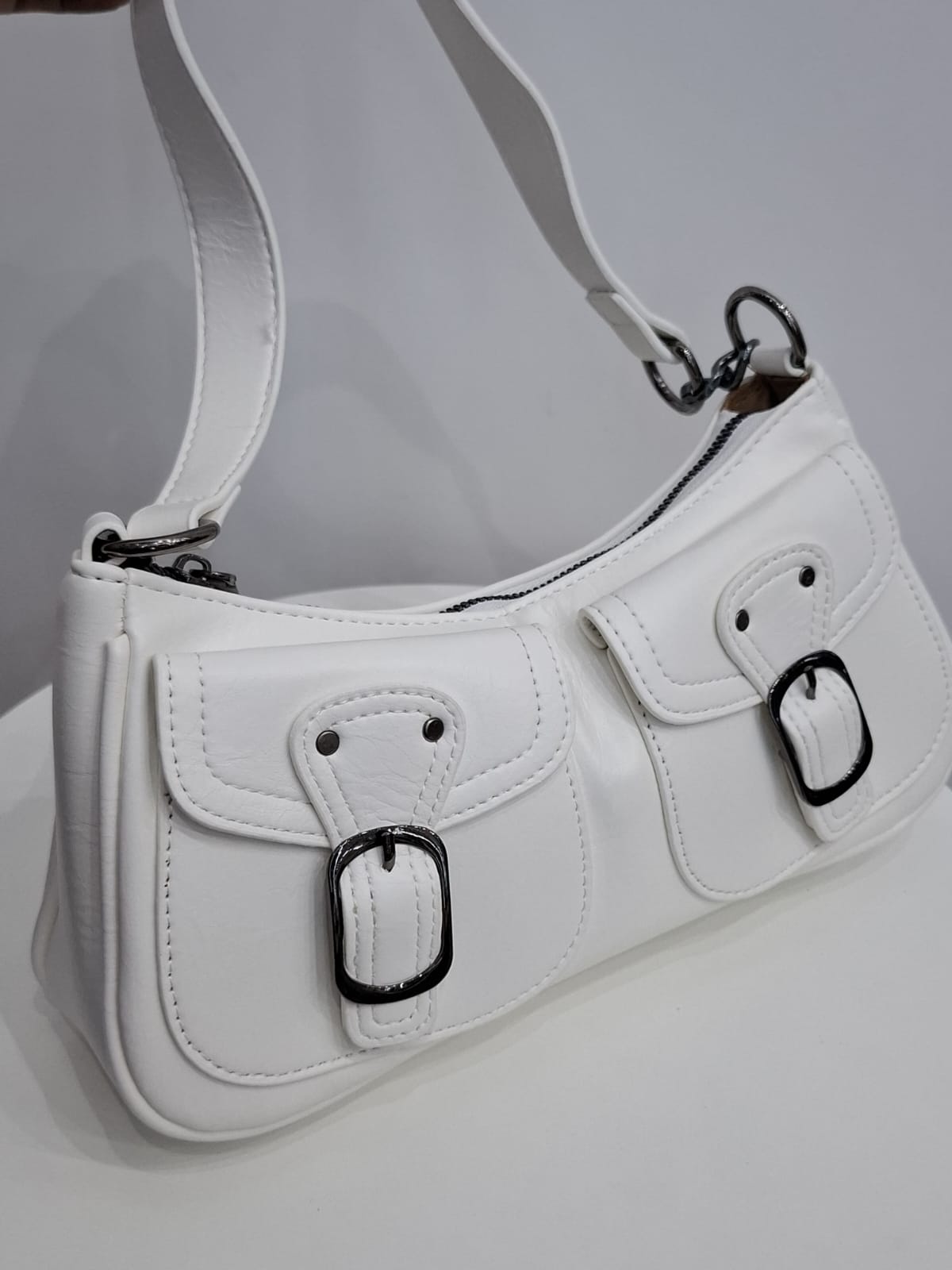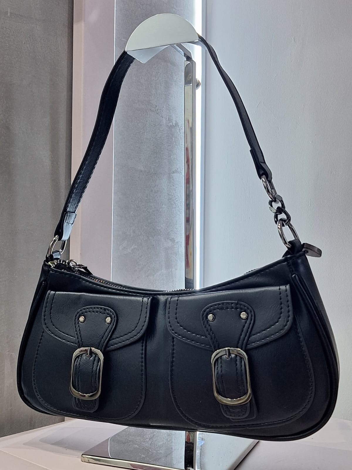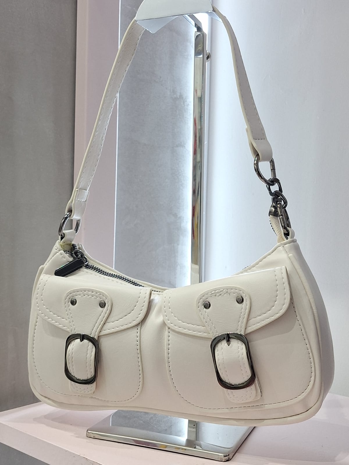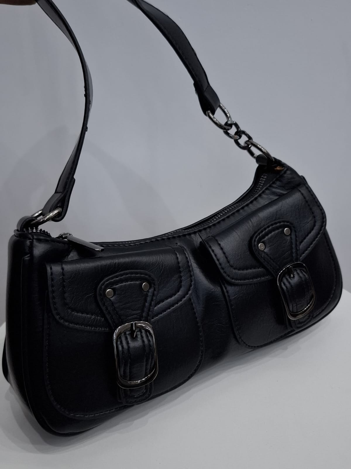 DETALLES: Detalles de hebilla de cinto en bolsillo delantero.